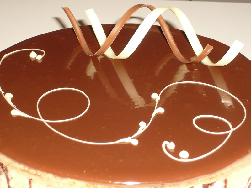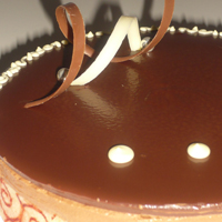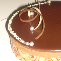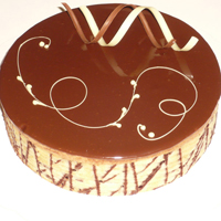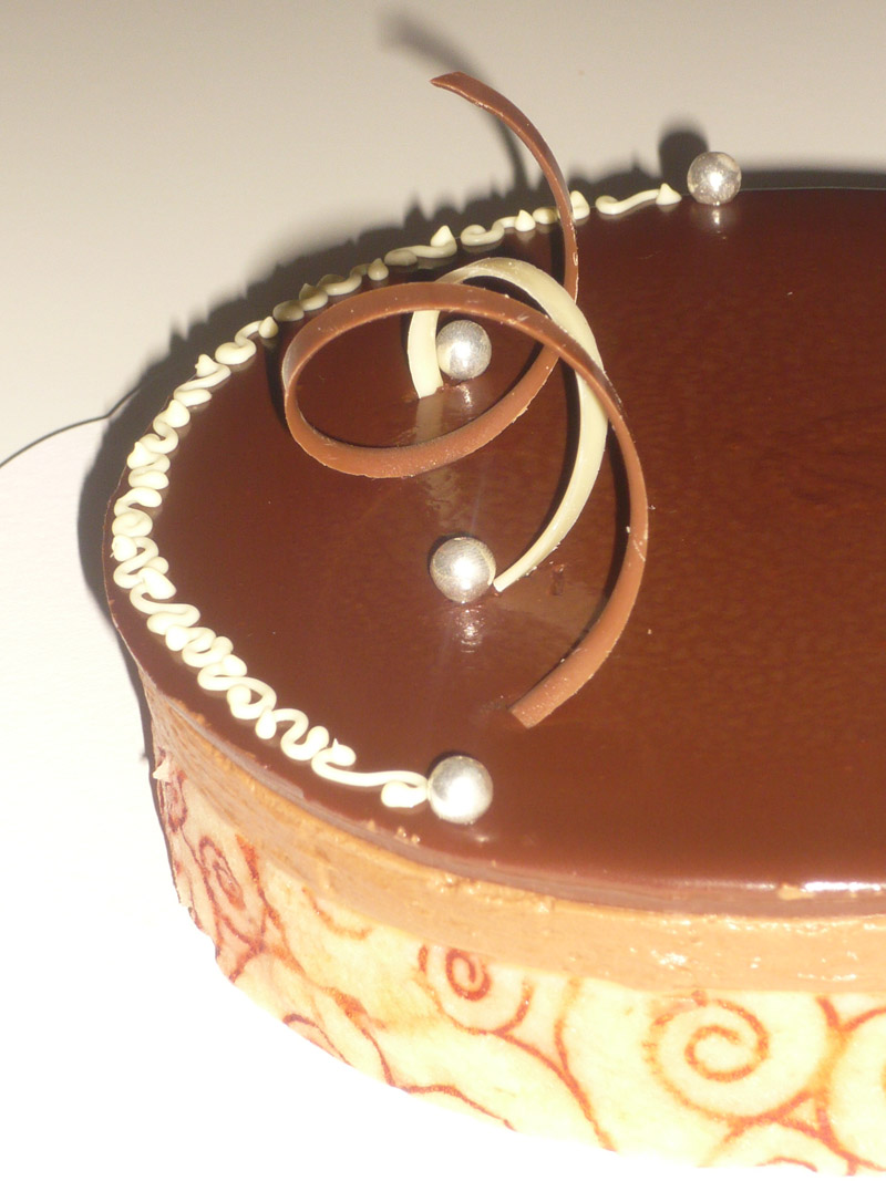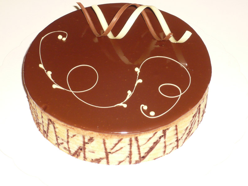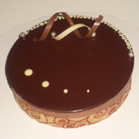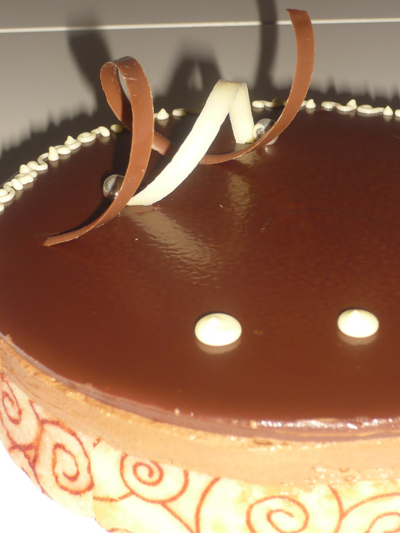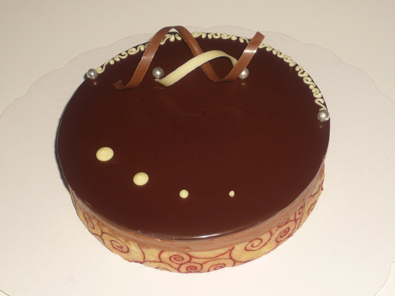 Ce gâteau se compose d’un délicieux biscuit moëlleux aux amandes et d’une mousse au chocolat noir. Il est recouvert d’une intense ganache au chocolat noir qui ne vous laissera pas indifférents. Quelques perles de sucre et décors en chocolat viennent orner ce gâteau pour le seul plaisir des yeux.