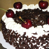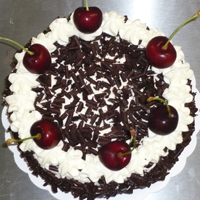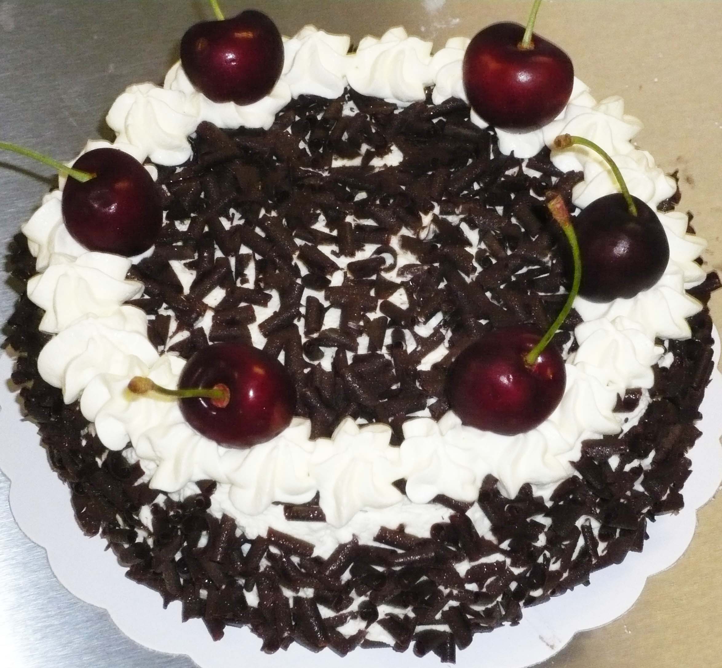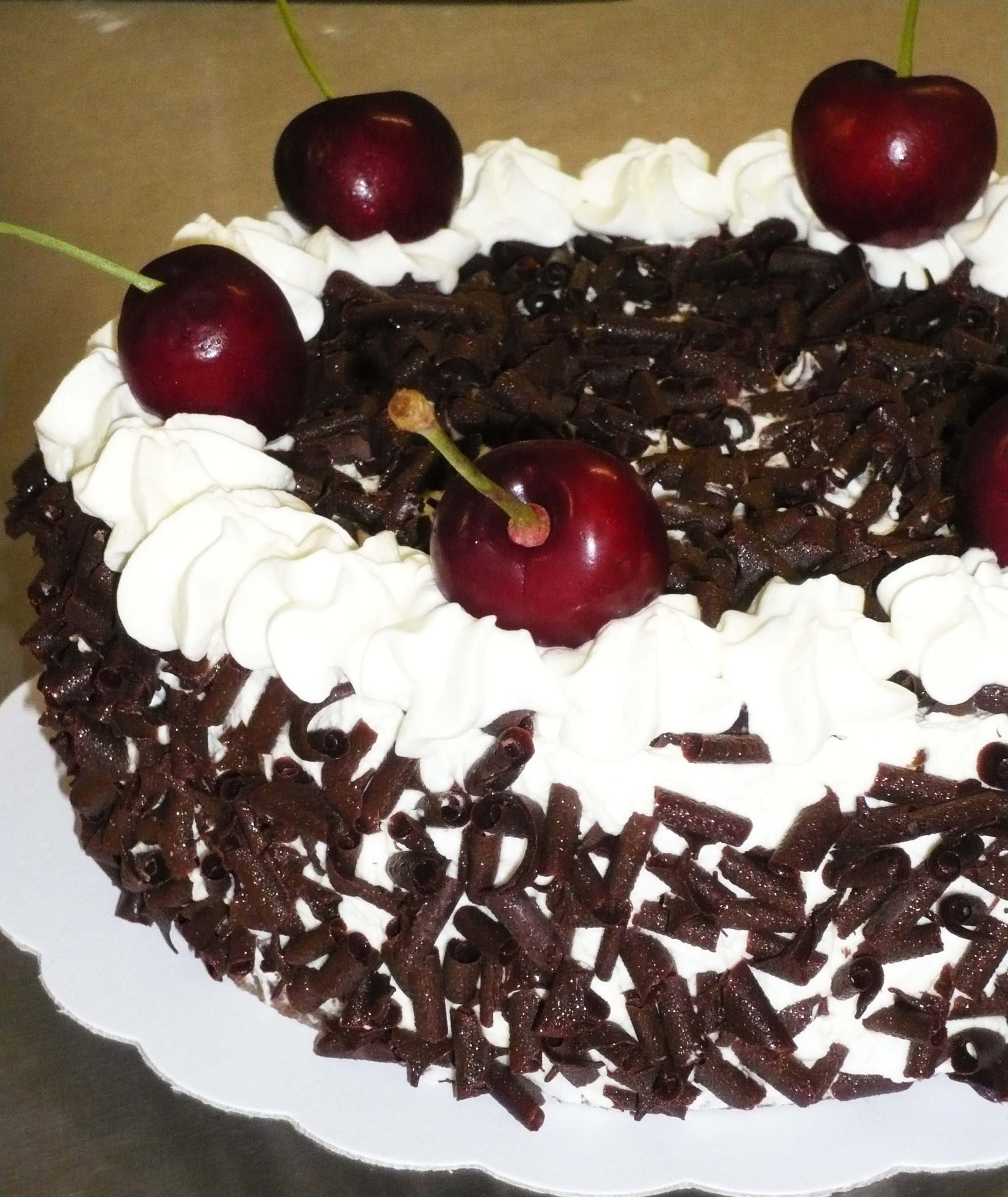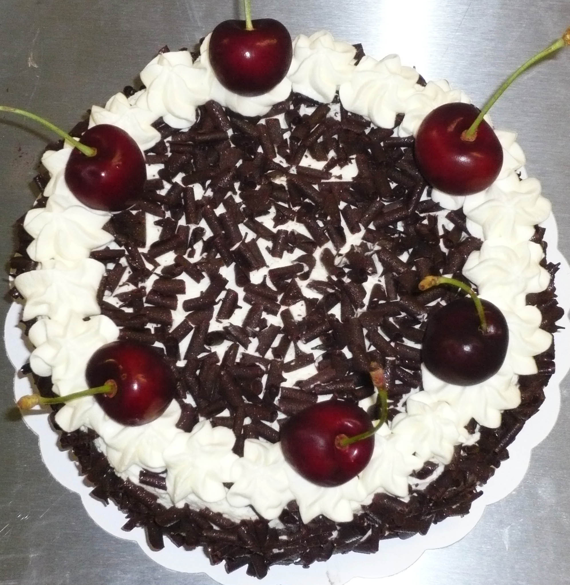 Ce classique de la pâtisserie se compose d'un biscuit moëlleux aux amandes et au chocolat punché au kirsch, de crème fraîche et de cerises. Il est recouvert intégralement de copeaux de chocolat noir et orné de cerises fraîches.