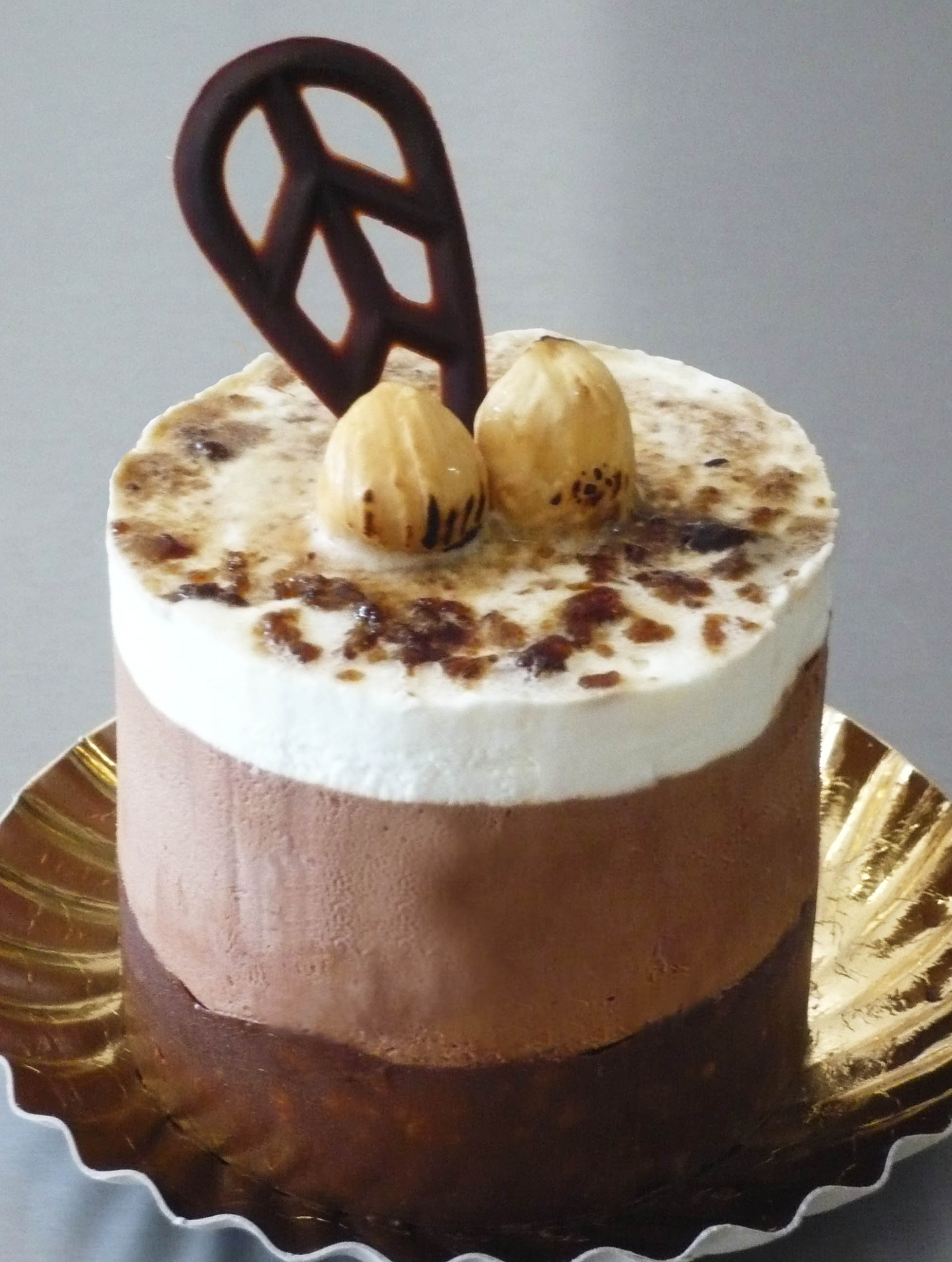 La mini croquantine est composée d'un biscuit moelleux aux amandes, d'une couche de praliné craquante et d'une mousse au chocolat noir.